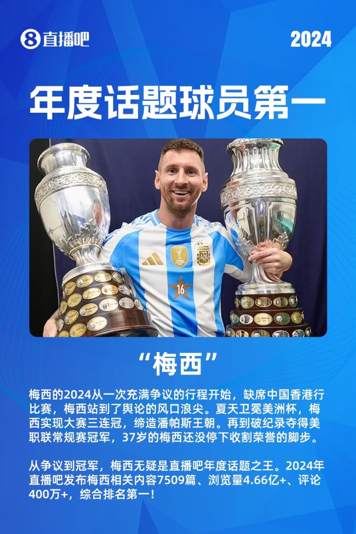 從爭議到冠軍,梅西無疑是年度話題之王。2024年發(fā)布梅西相關(guān)內(nèi)容7509篇,瀏覽量4.66億+,評論400萬+,綜合排名第一!