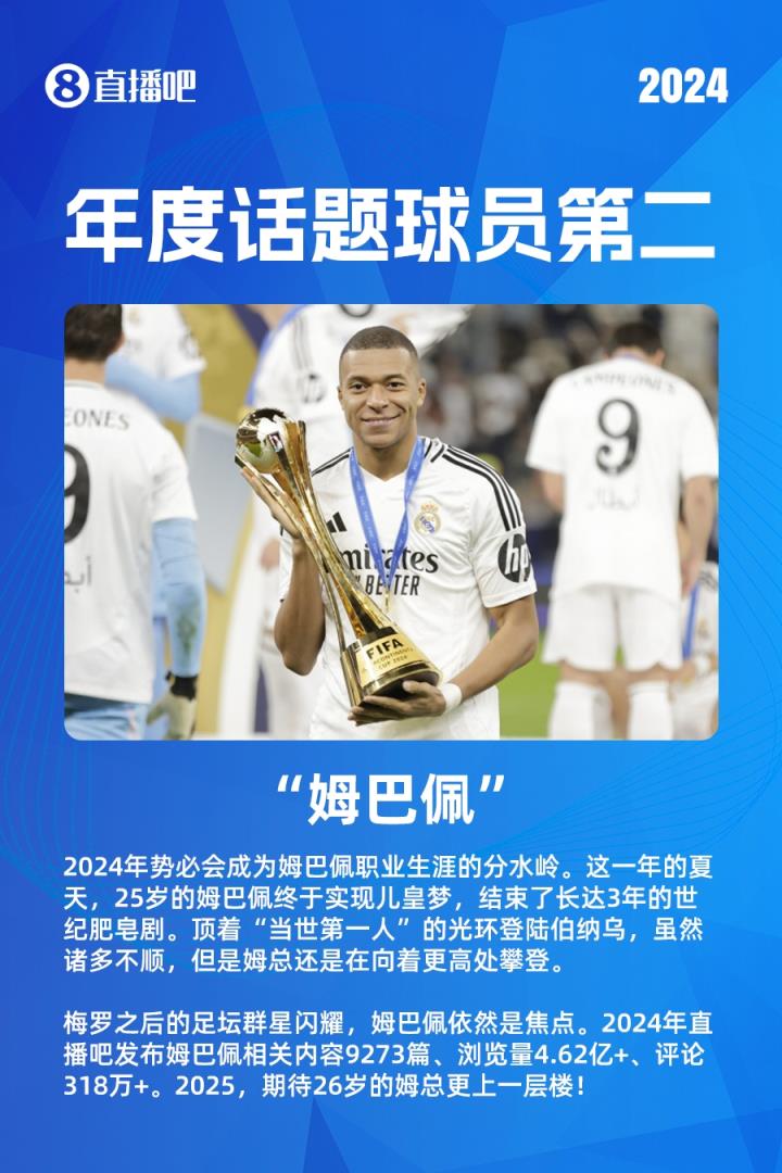 梅羅之后的足壇群星閃耀,姆巴佩依然是焦點。2024年發(fā)布姆巴佩相關(guān)內(nèi)容9273篇、瀏覽量4.62億+、評論318萬+。2025,期待26歲的姆總更上一層樓!