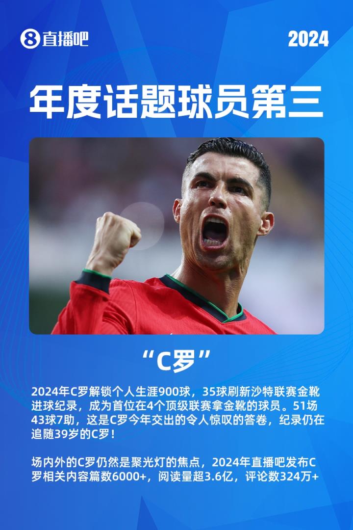 場內(nèi)外的C羅仍然是聚光燈的焦點,2024年發(fā)布C羅相關(guān)內(nèi)容篇數(shù)6000+,閱讀量超3.6億,評論數(shù)324萬+。