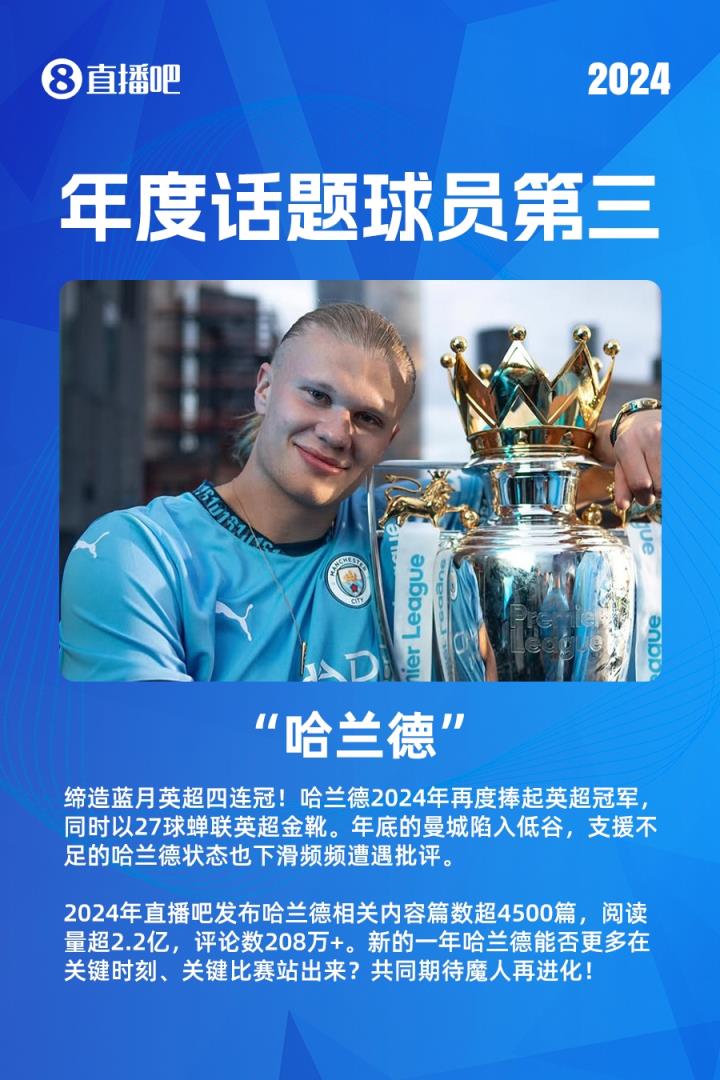 2024年發(fā)布哈蘭德相關(guān)內(nèi)容篇數(shù)超4500篇,閱讀量超2.2億,評論數(shù)208萬+。新的一年哈蘭德能否更多在關(guān)鍵時刻、關(guān)鍵比賽站出來?共同期待魔人再進化!