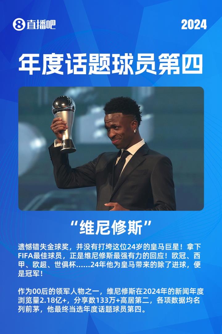 作為00后的領(lǐng)軍人物之一,維尼修斯在2024年的新聞年度瀏覽量2.18億+,分享數(shù)133萬+高居第二,各項數(shù)據(jù)均名列前茅,他最終當選年度話題球員第四。