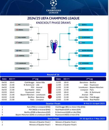 2月22日訊 24/25賽季歐冠淘汰賽賽程出爐,1/8決賽首回合將在3月5日凌晨開戰(zhàn)。